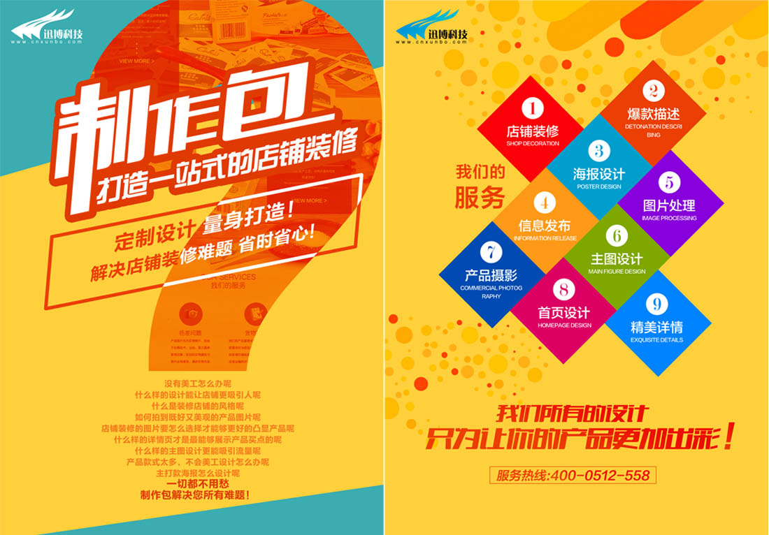店鋪制作包:對(duì)店鋪的招牌,自定義模塊,分類、首頁(yè)以及寶貝詳情頁(yè)面的美化裝飾!結(jié)合產(chǎn)品特點(diǎn)配合整體版面布局以及色彩搭配為企業(yè)打造具有視覺沖擊力的店鋪,從而吸引買家的停留以及彰顯企業(yè)實(shí)力。